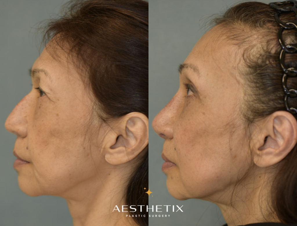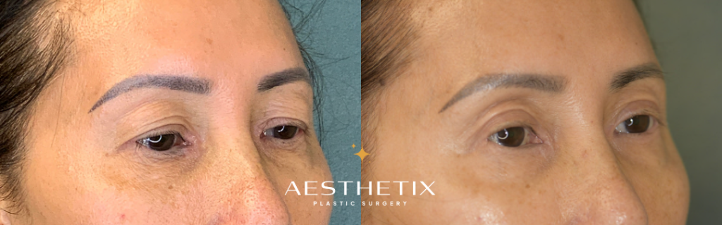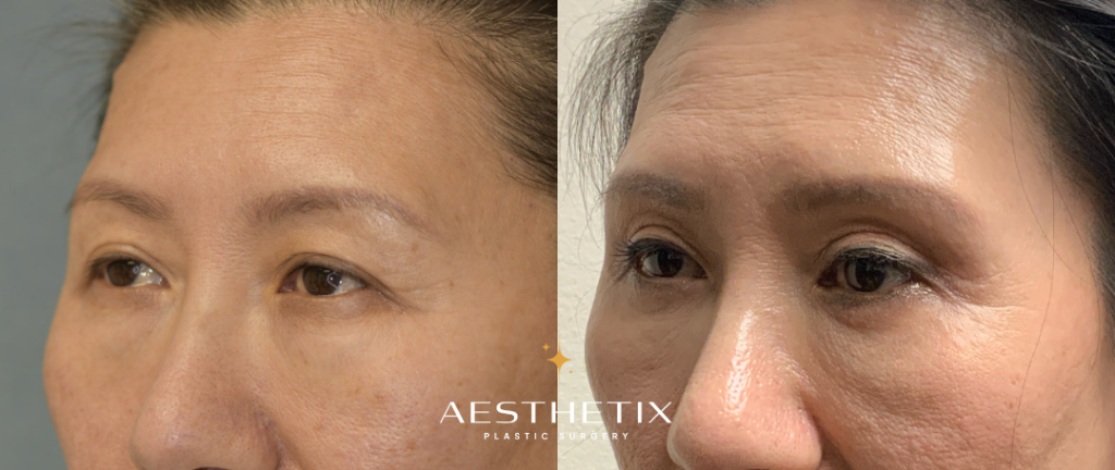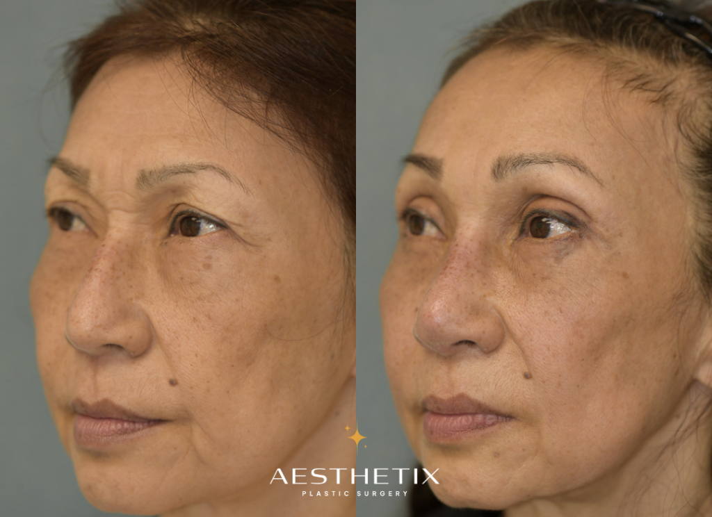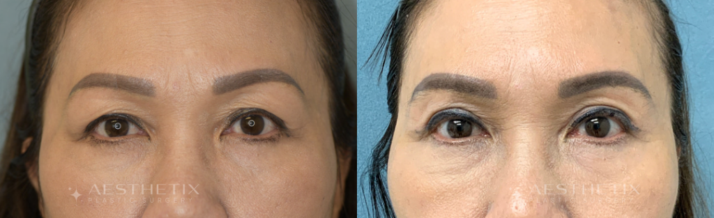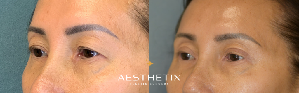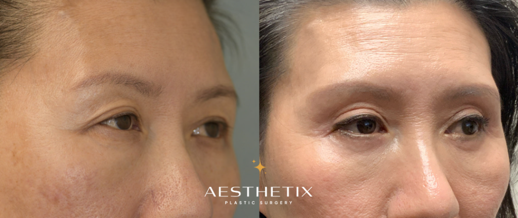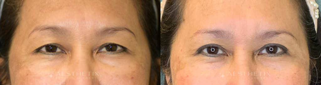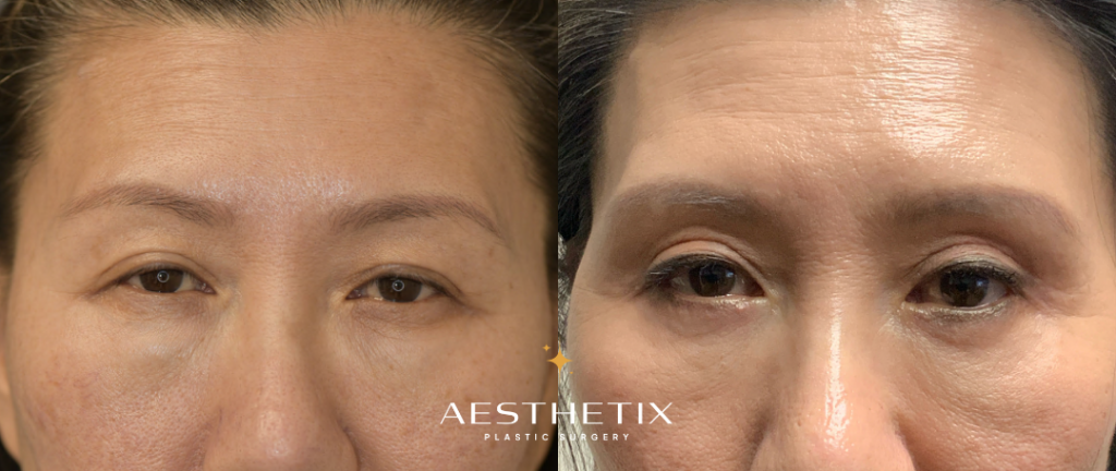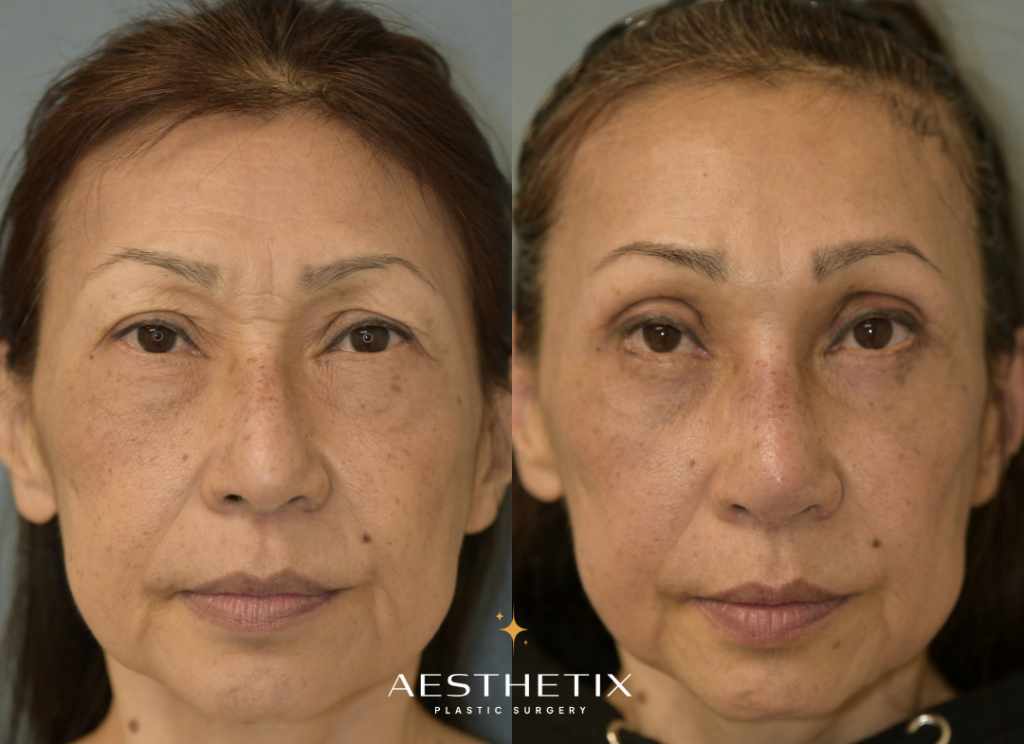 Patient is 50 a 50-year-old female. She has distinct double eyelids. However, due to natural aging, her upper eyelids are starting to droop, causing them to cover her double eyelids. Patient feels that this makes her look tired, which prompted her to receive this surgery. A width of 4mm of skin was removed from both sides. After the surgery, her eyes now look brighter and gentler.