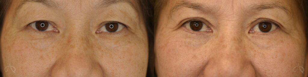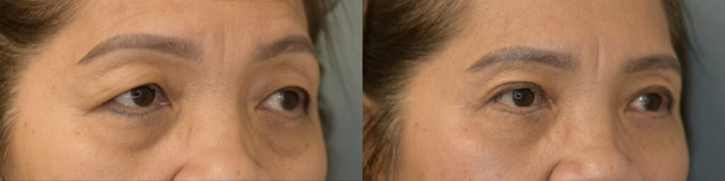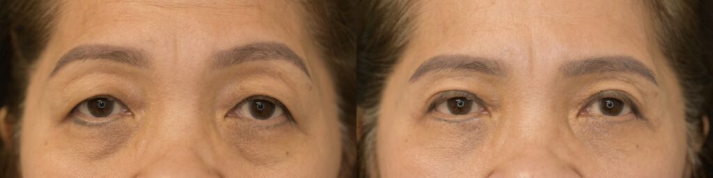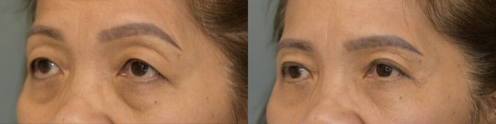 Patient received an upper and lower blepharoplasty. Dr. Vu removed excess skin on the upper eyelids and redistributed fat in her under eye.