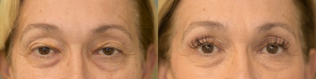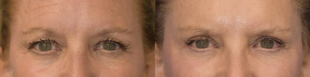 Patient is a 50-year-old female. She had extra loose skin on her upper eyelids that was drooping down towards her eyes. Excess skin was removed, as well as some fat deposits under the eyelids.