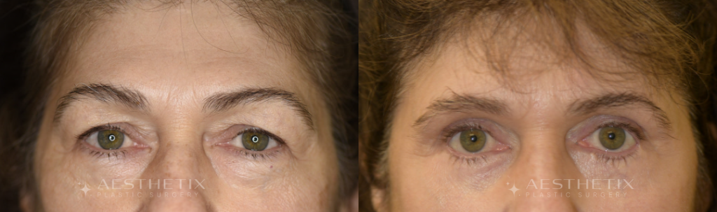 Patient is a 63-year-old male. Patient had an eyelid repair after previously having a lower blepharoplasty with another plastic surgeon. He had an upper blepharoplasty and used excess fat from the upper eyelids as a skin graft for the lower eyelid repair. The pre-operative and post-operative photos were taken 1 week apart and then 2 months apart.