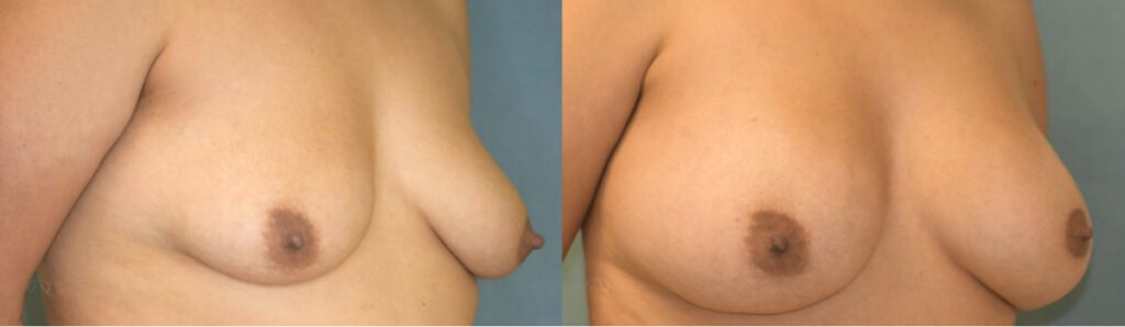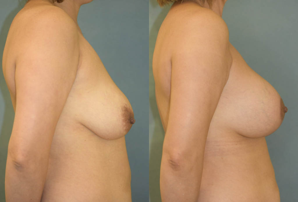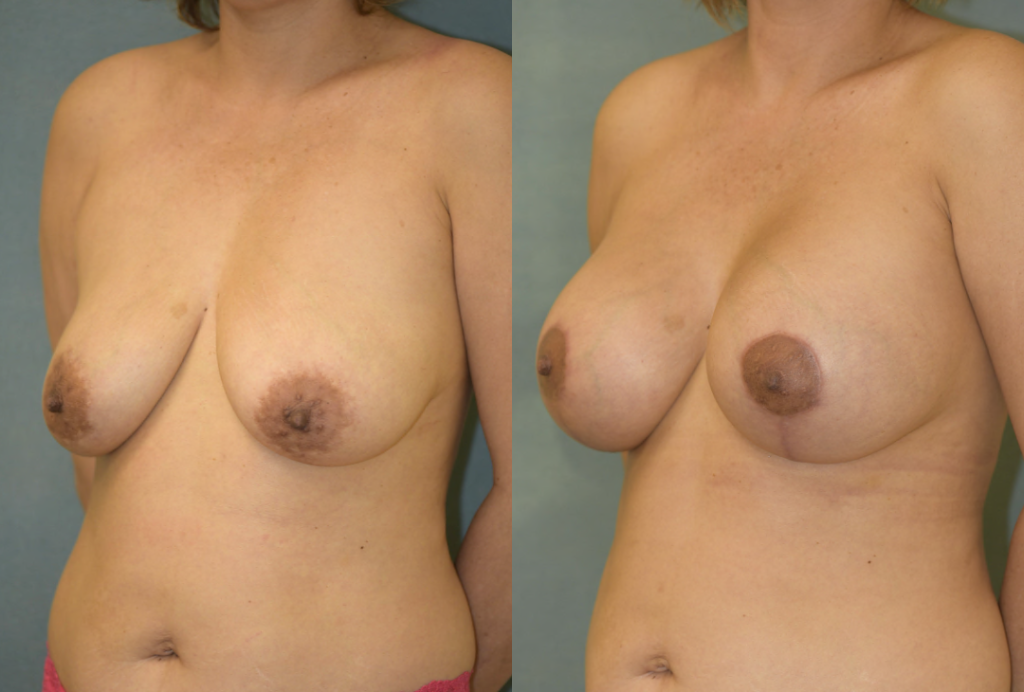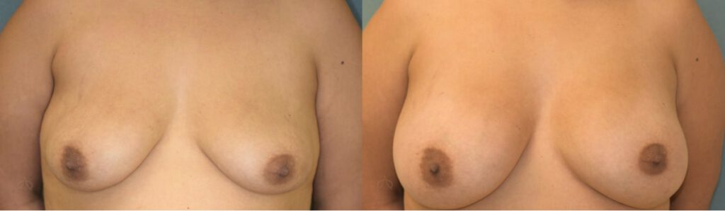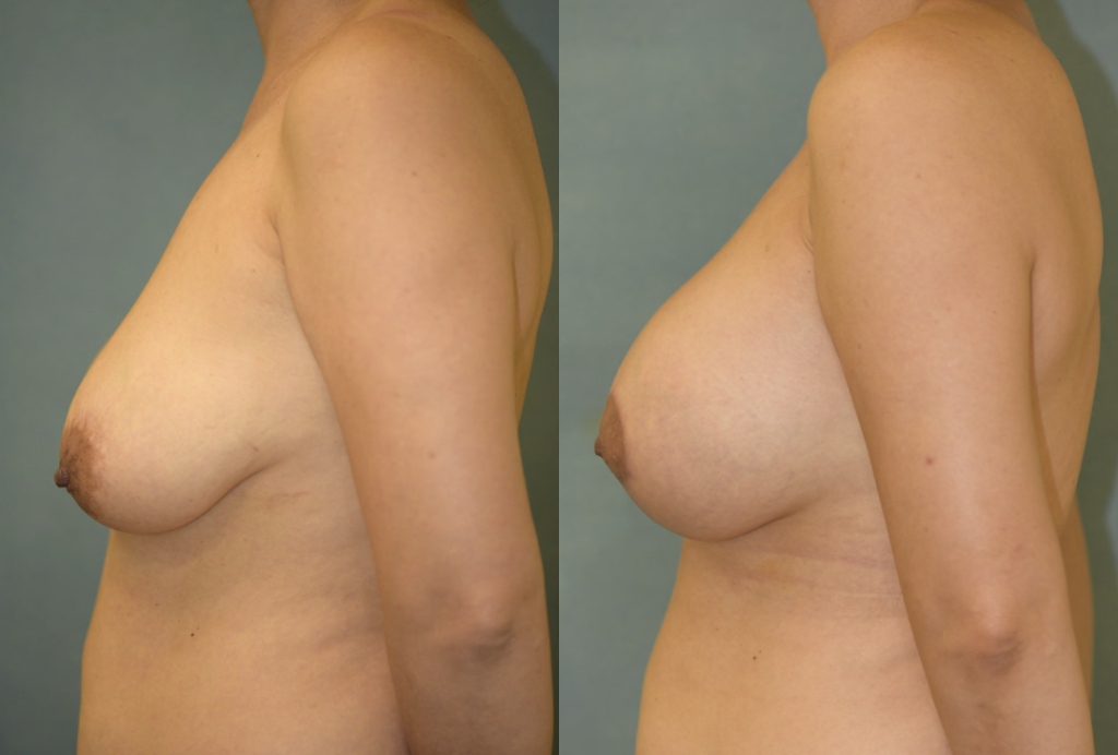 Patient is a 44-year-old female. She is 5’ 4” and 120 lbs. Patient had a breast augmentation. She received 325 cc saline implants. The pre-operative and post-operative pictures were taken 1 month apart.