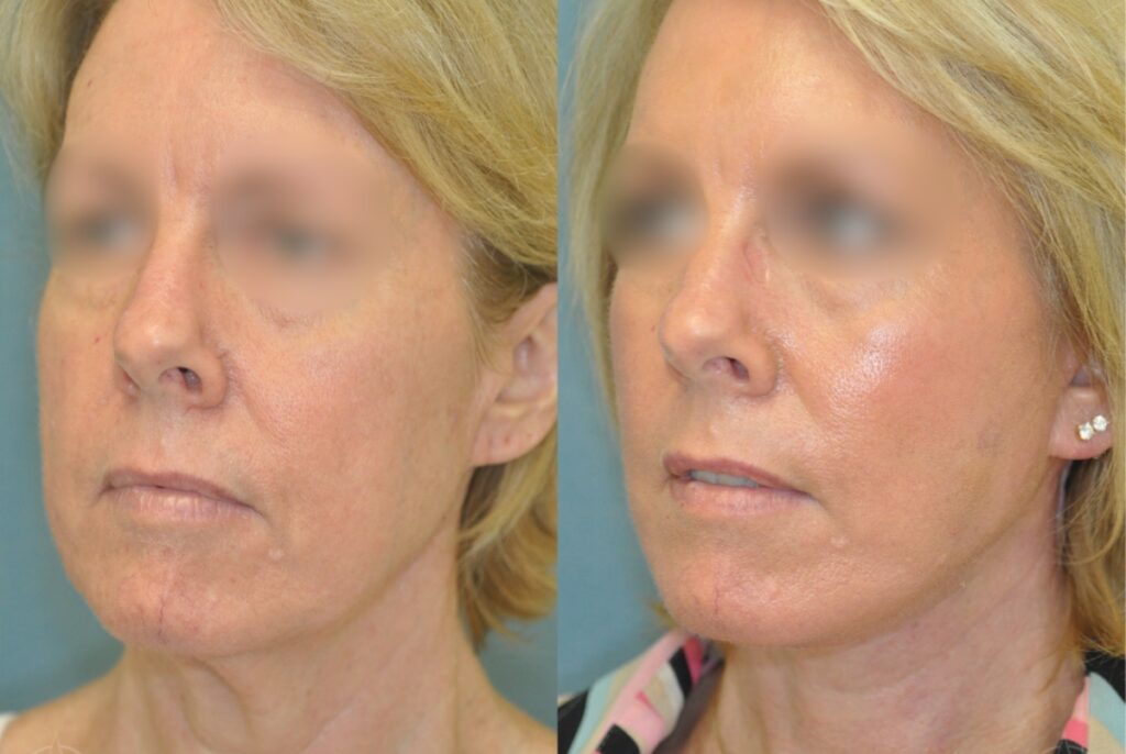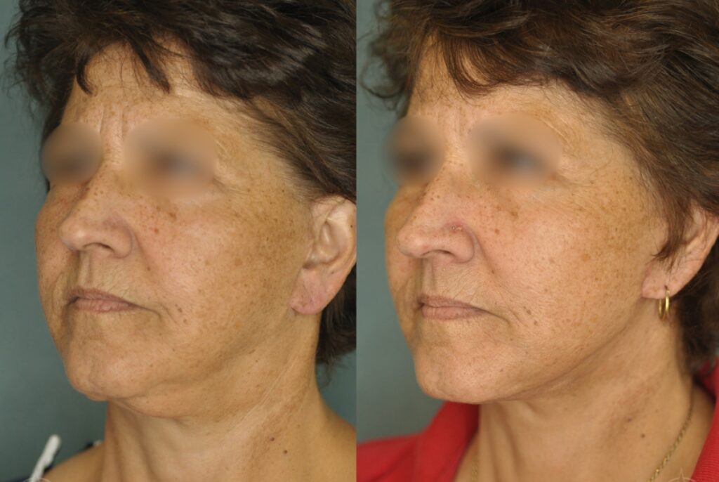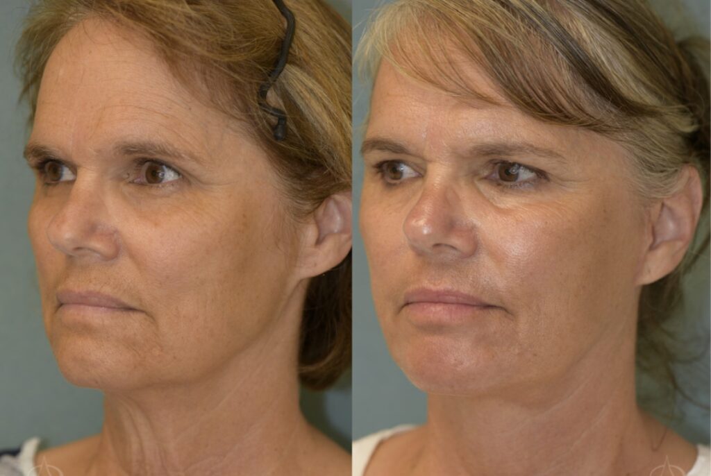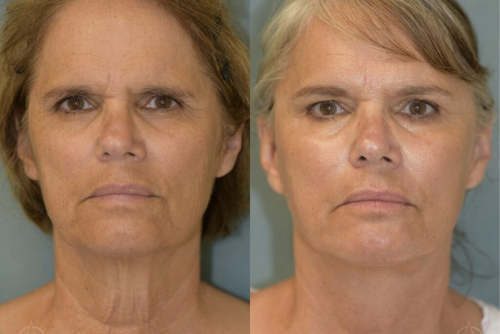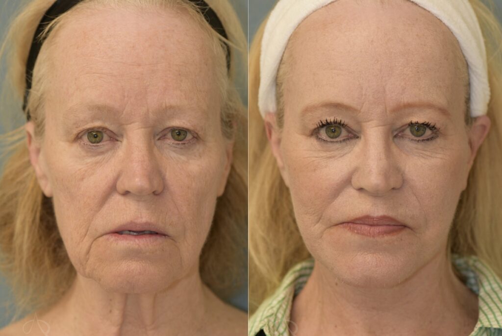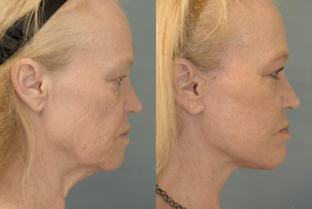 Patient is a 61-year-old female who received a facelift to reduce the appearance of sagging skin and wrinkles. The photos were taken 6 weeks apart.